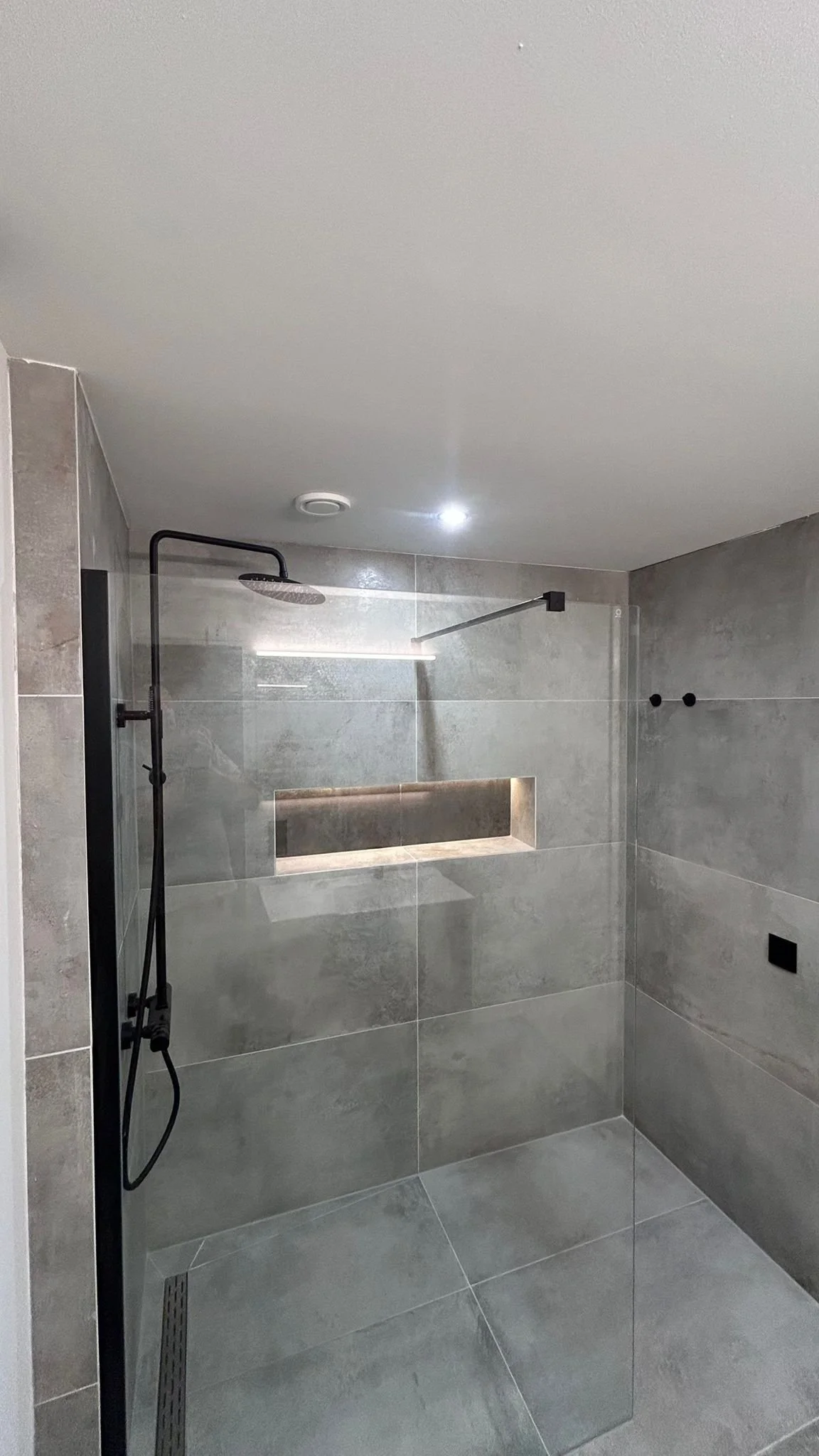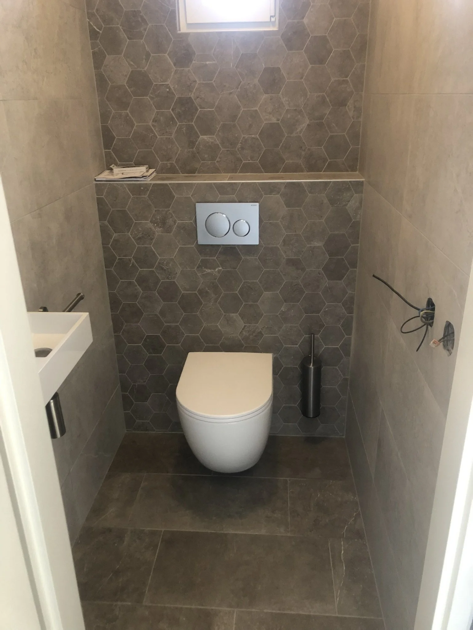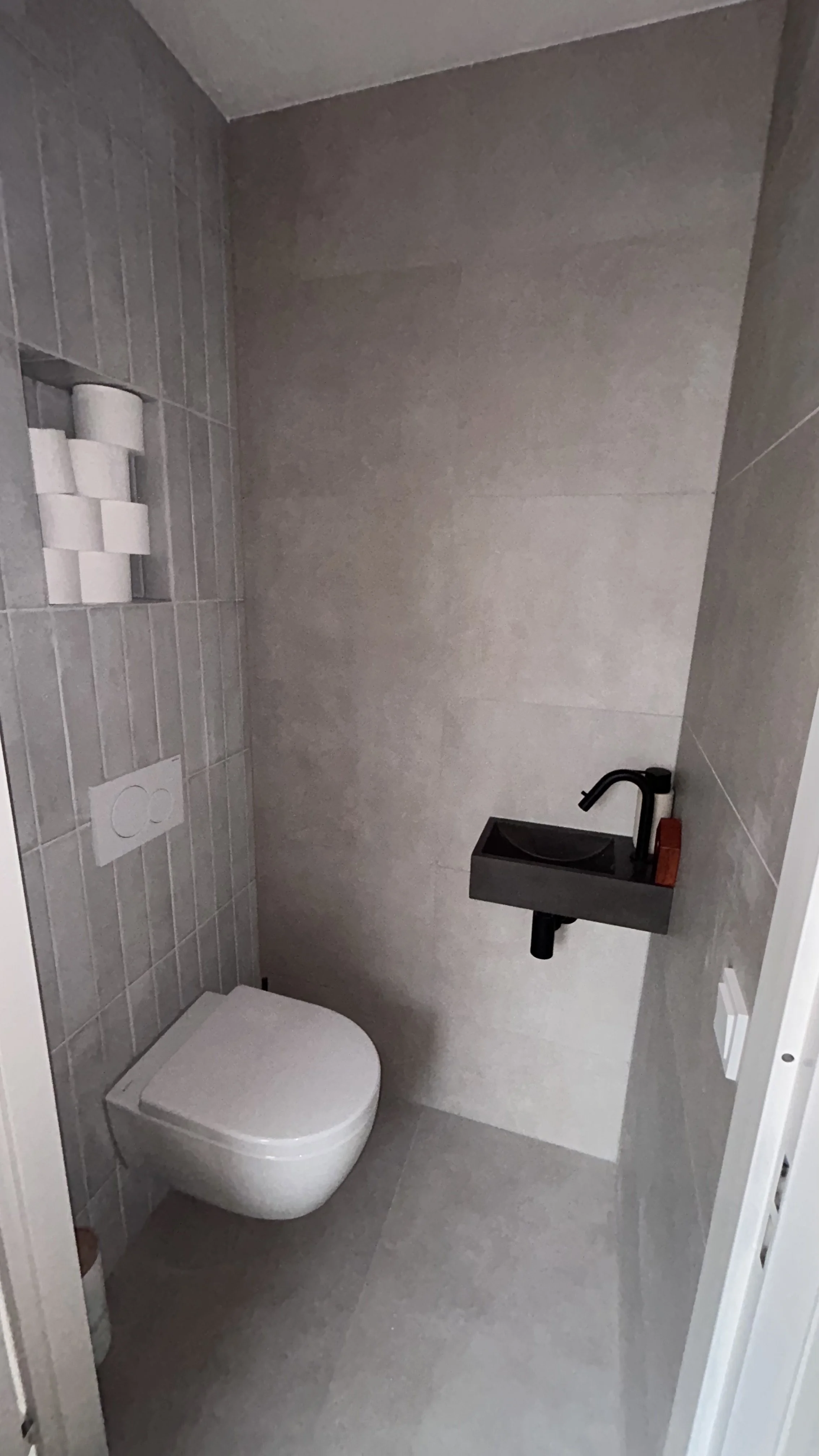 Badkamer Badkamer Dakterras Wandtegelwerk Vloertegelwerk Sanitair Timmerwerk Toilet renovatie Groot formaat tegels Spuitwerk