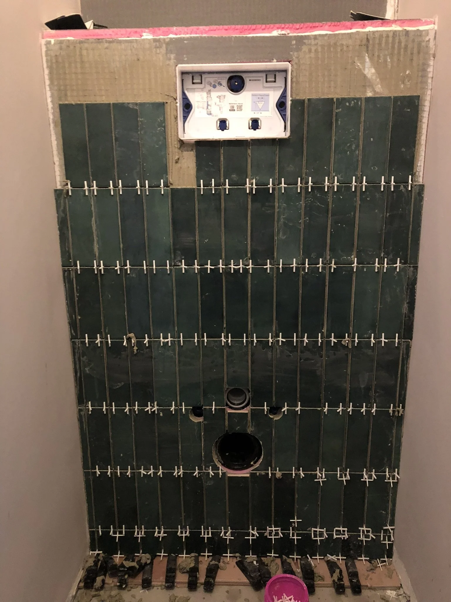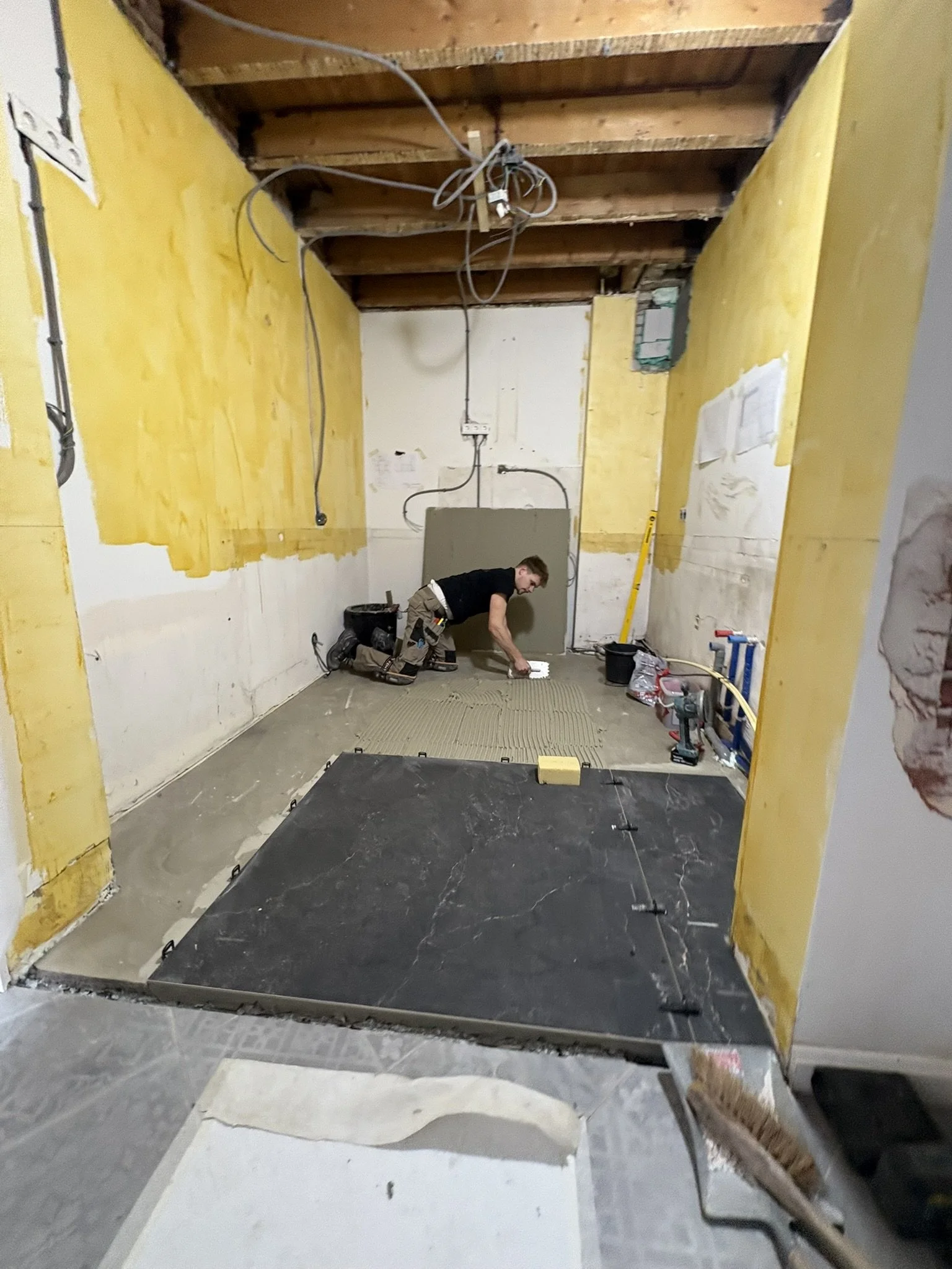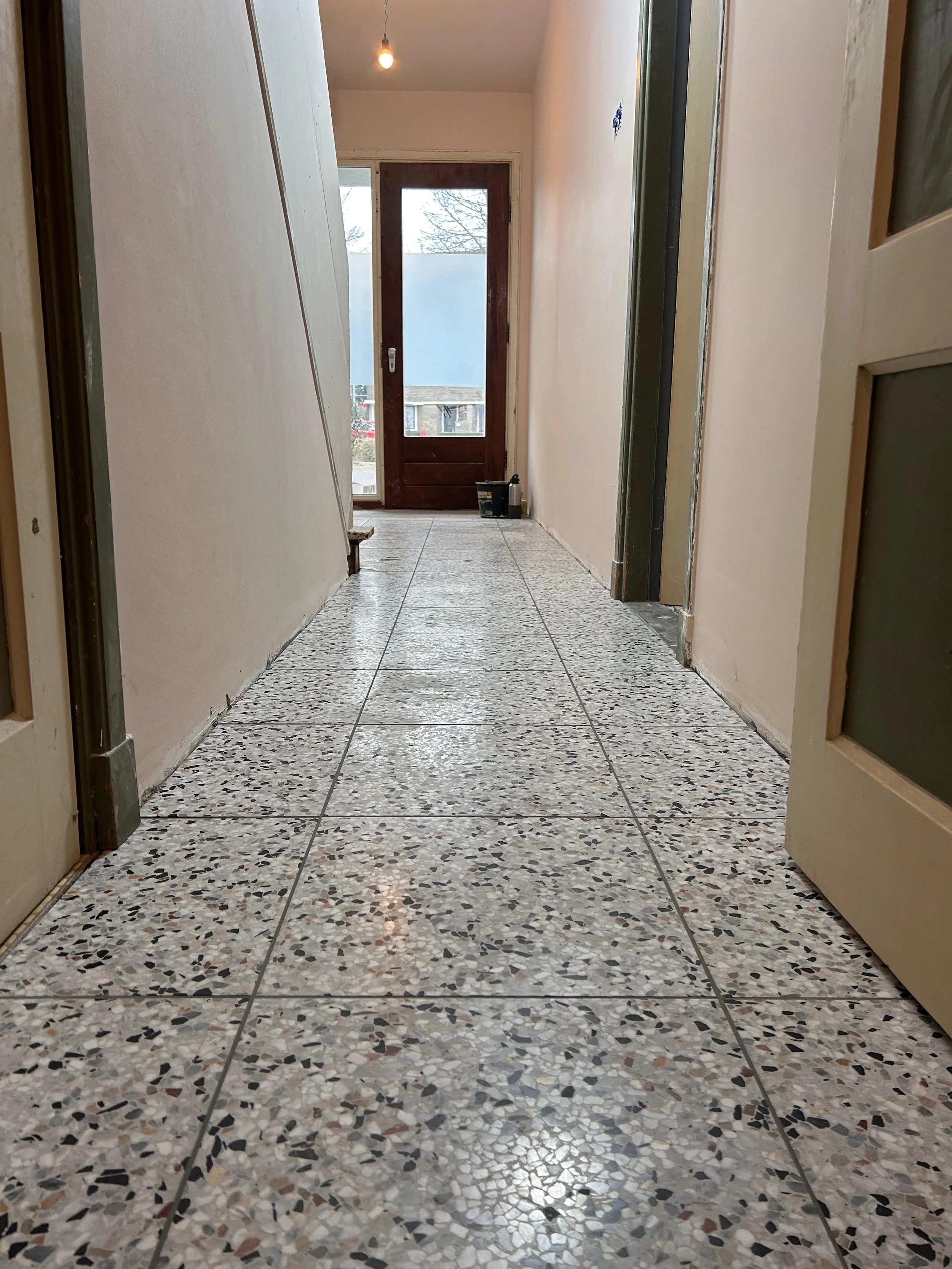 Badkamer Badkamer Dakterras Wandtegelwerk Vloertegelwerk Sanitair Timmerwerk Toilet renovatie Groot formaat tegels Spuitwerk
