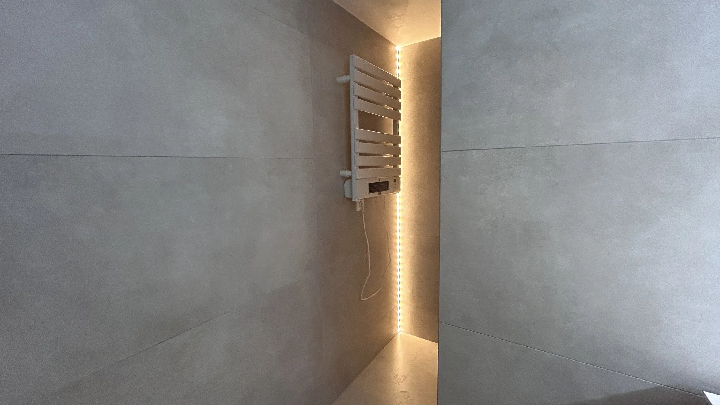 In het douchegedeelte is een gemetselde afscheidingswand met geïntegreerde nis gerealiseerd, volledig in harmonie met het tegelwerk. In de nis is een dimbare Philips Hue ledstrip verwerkt, die in kleur en intensiteit verstelbaar is en zo zorgt voor een sfeervolle verlichting.